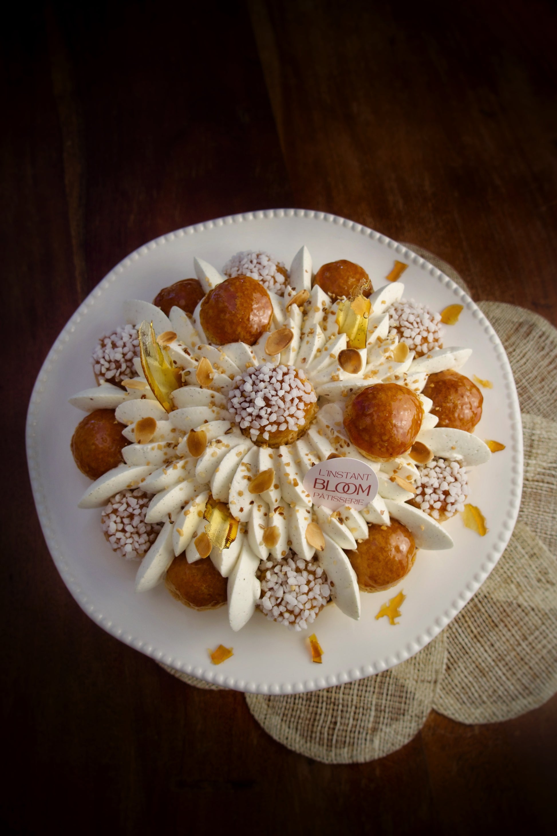 Le Saint-Honoré se compose de choux caramélisés garnis d'une crème diplomate et de caramel coulant, délicatement disposés sur un disque de pâte feuilletée maison. Une chantilly vanillée légère, finement pochée, vient parfaire l'ensemble et donner à ce classique intemporel toute son allure raffinée.